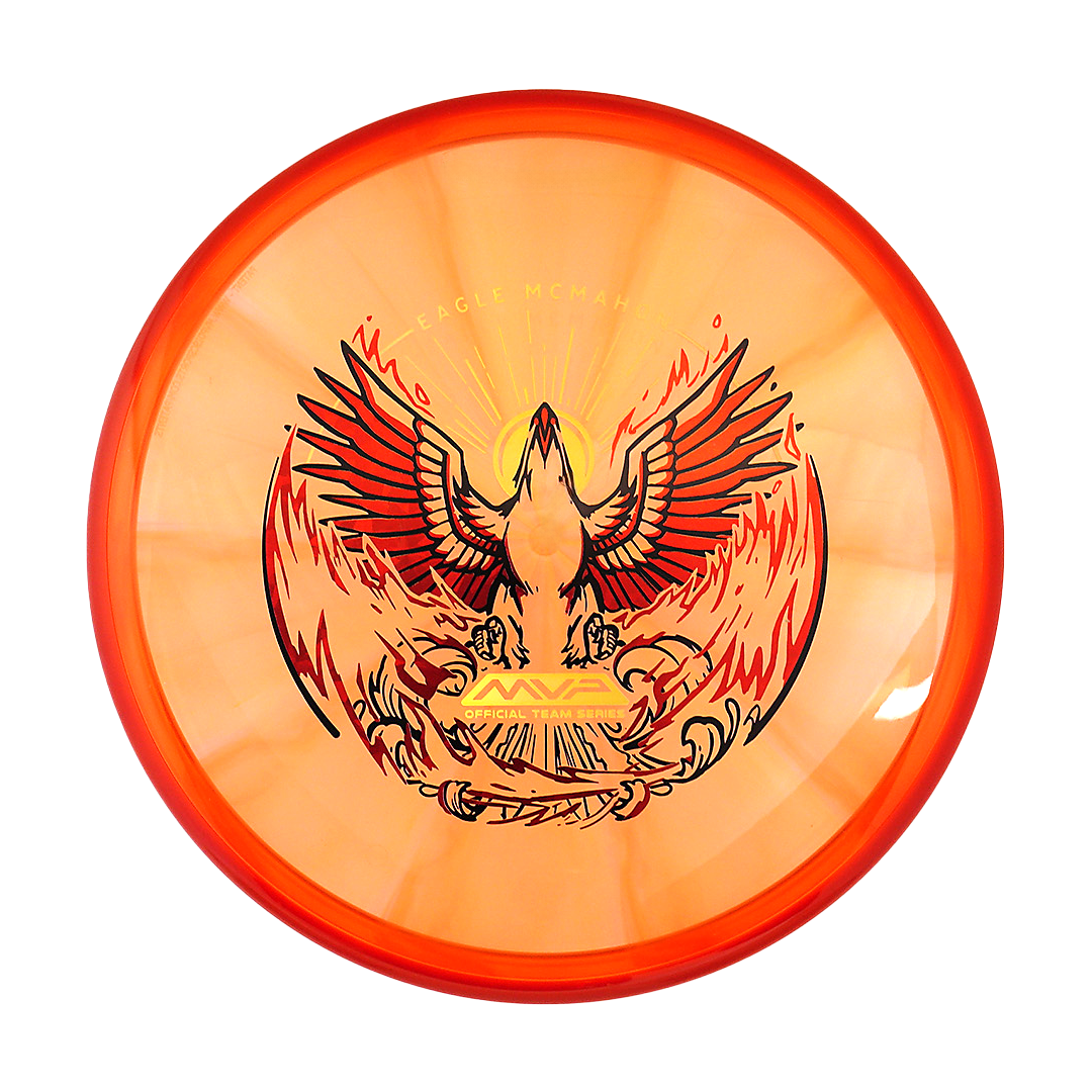 Like a phoenix rising from the ashes, Eagle McMahon’s first Official Team Series disc fully embraces the idea of new beginnings and the fire that burns within. Suitably named “Rebirth”, Mike Inscho has beautifully illustrated Eagle’s first triple-foil stamp, featuring an eagle rising from the ashes on his personal mold of choice, the Prism Proton Envy. Don’t miss your chance to snag the very first of what is sure to be a long line of discs that directly support Eagle!