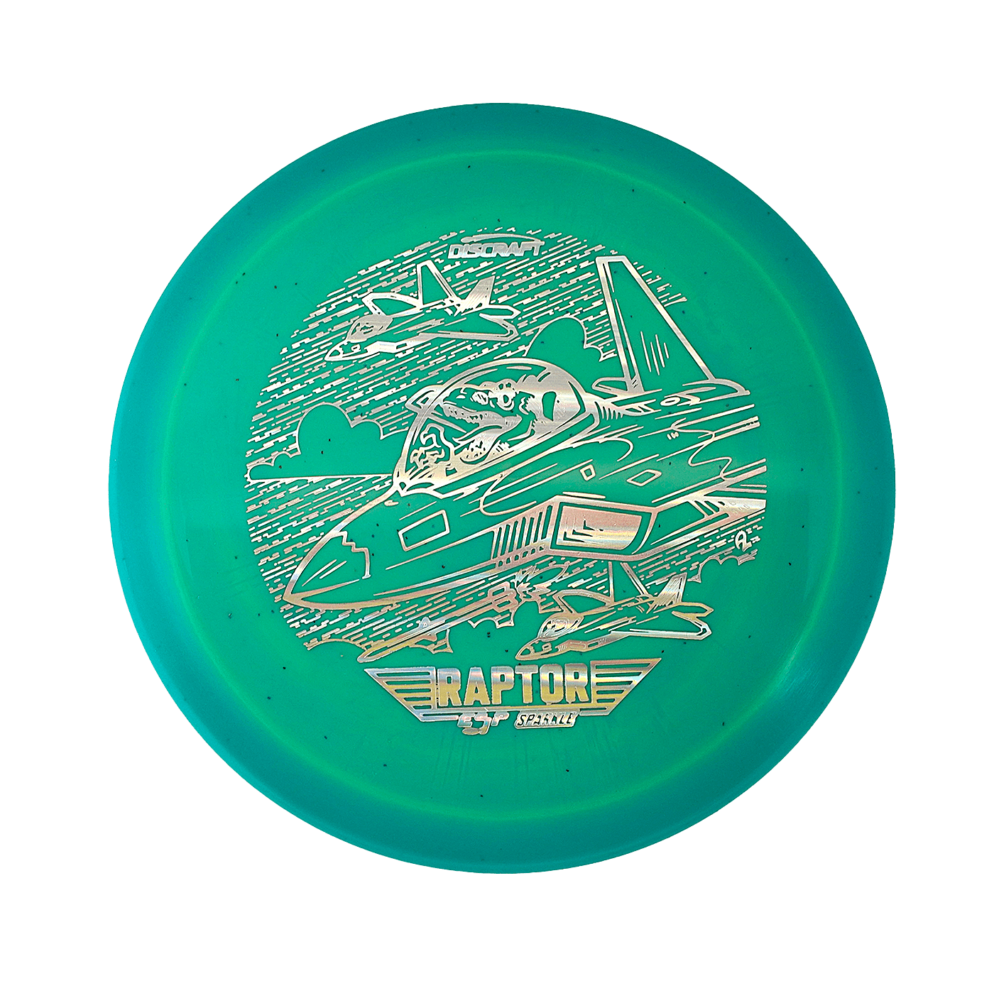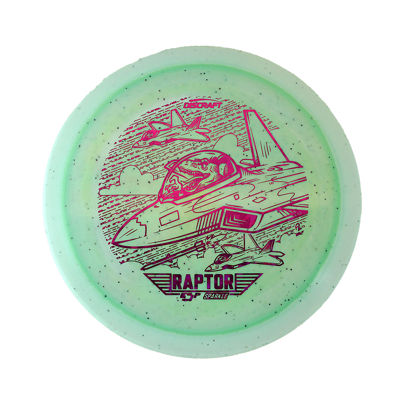 The ESP plastic in this run is tacky with a bit of flex for an amazing feel in the hand. The coloration in these Raptors produces a halo-like border around the rim. This particular run is much lighter than a standard produced run of Raptors, with weights ranging in the mid-to-low 160s. However, this run still maintains the trusted overstability of a stereotypical Raptor. The stamp features raptor dinosaurs flying fighter jets on an attack mission.