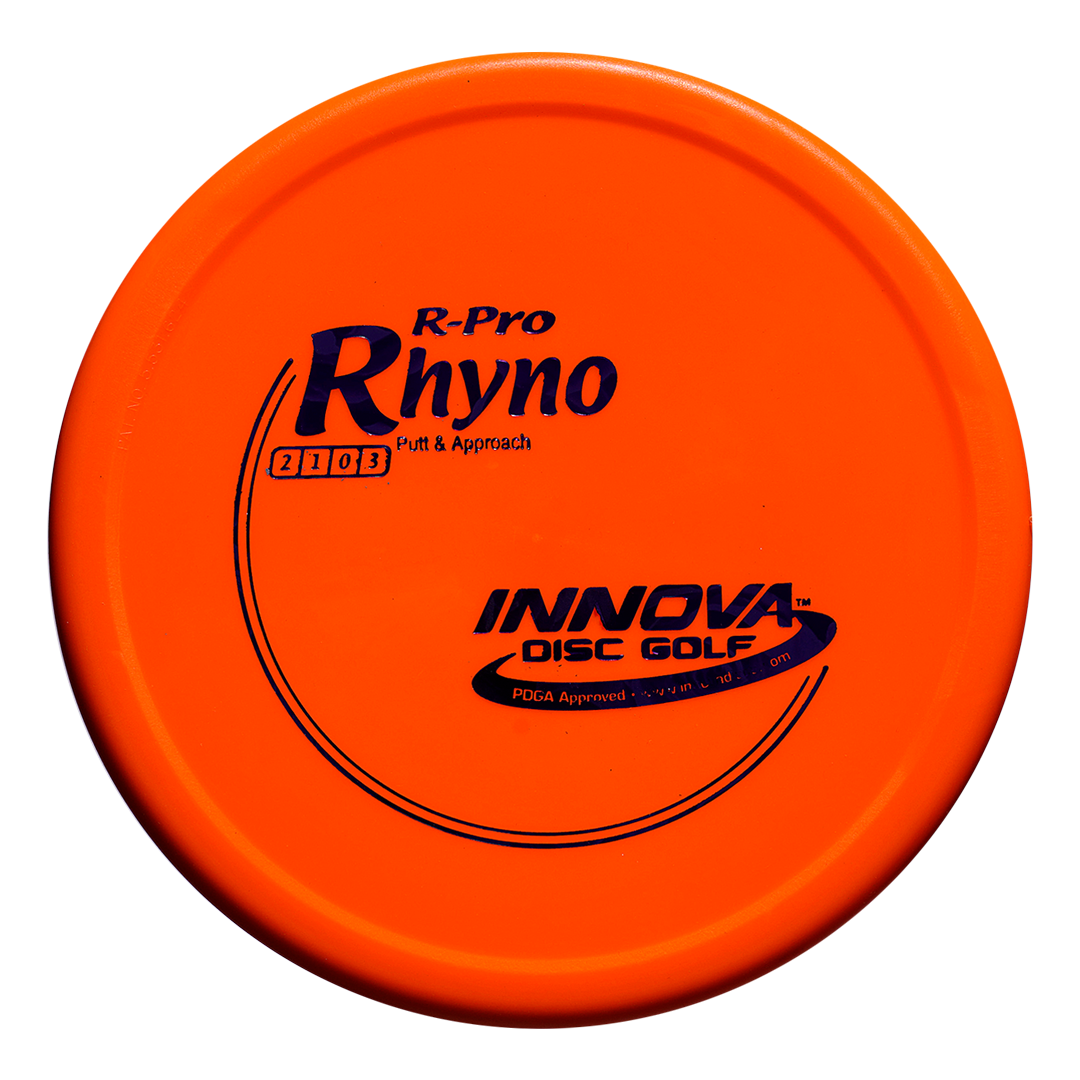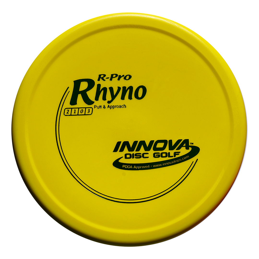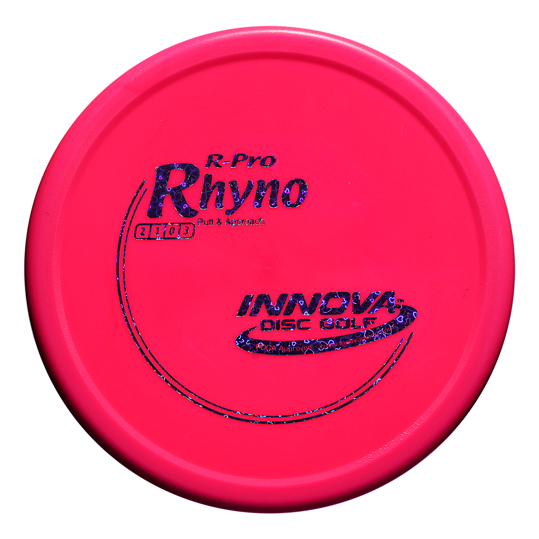The Rhyno is an overstable putt and approach disc that can handle headwinds. Great for players with lots of throwing power as the Rhyno stops on a dime and stays close to the basket. It is a must have disc for short to medium up shots and putting into the wind. The R-Pro model is also called a "Soft" Rhyno and is made to be super soft and flexible in an extra grippy plastic that grabs the chains.