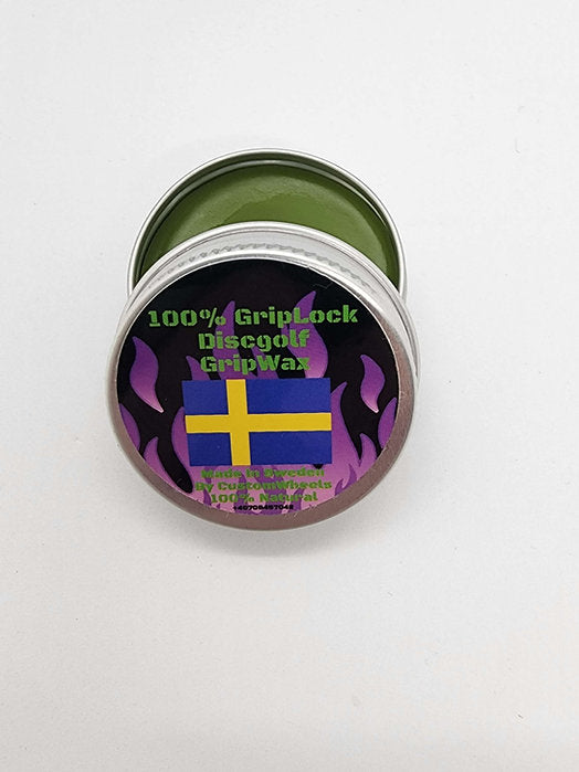 Smaller, pocket-sized container of GripLock handmade disc golf wax.