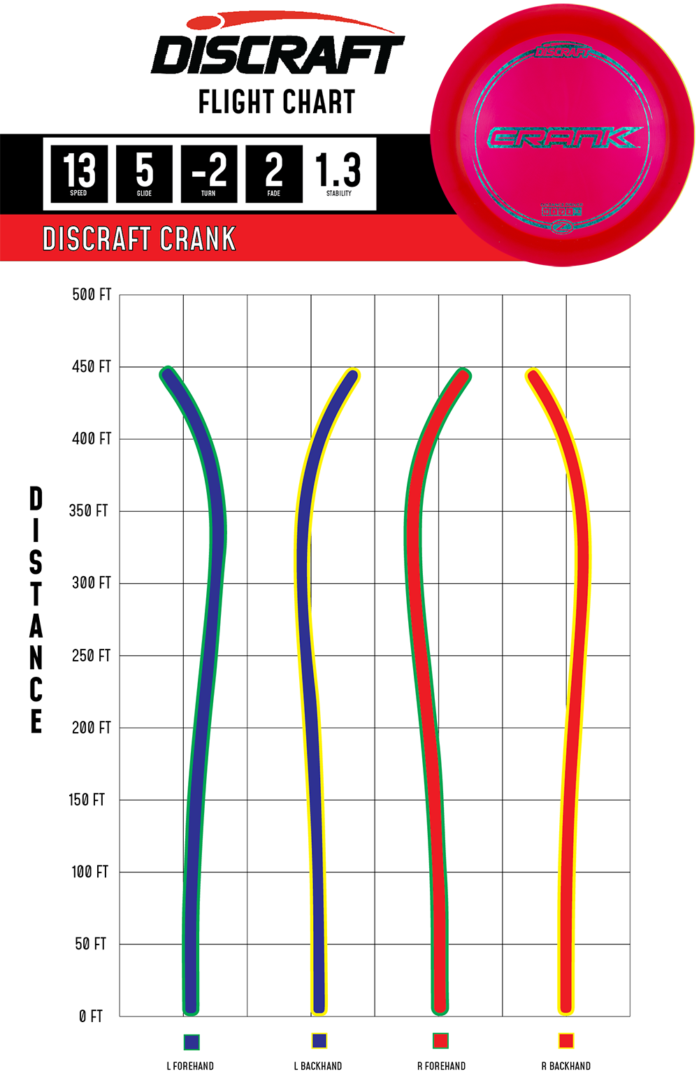 The Crank is a high speed driver with a balanced turn and fade that can reach huge distances. Useful for players of all skill levels and for lower arm speeds.